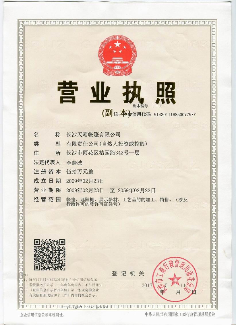 長(zhǎng)沙天霸帳篷有限公司是湖南省一家生產(chǎn)廣告帳篷、庭院帳篷、工程帳篷、廣告太陽傘及特大型展覽篷房的正規(guī)企業(yè)。擁有國家注冊(cè)商標(biāo)12年,是國內(nèi)罕有幾家擁有國家注冊(cè)商標(biāo)的企業(yè)之一;天霸帳篷是我公司品牌。經(jīng)過多年的努力和發(fā)展,堅(jiān)持以質(zhì)量可靠、價(jià)格實(shí)在、服務(wù)周到、誠實(shí)守信為宗旨,長(zhǎng)期為國內(nèi)外品牌如:中國移動(dòng)、 中國聯(lián)通、 中國電信、 格力空調(diào)、加多寶、青島啤酒、長(zhǎng)虹電器、康師傅、農(nóng)夫山泉、娃哈哈、康佳等100多家一線企業(yè)做配套服務(wù)。